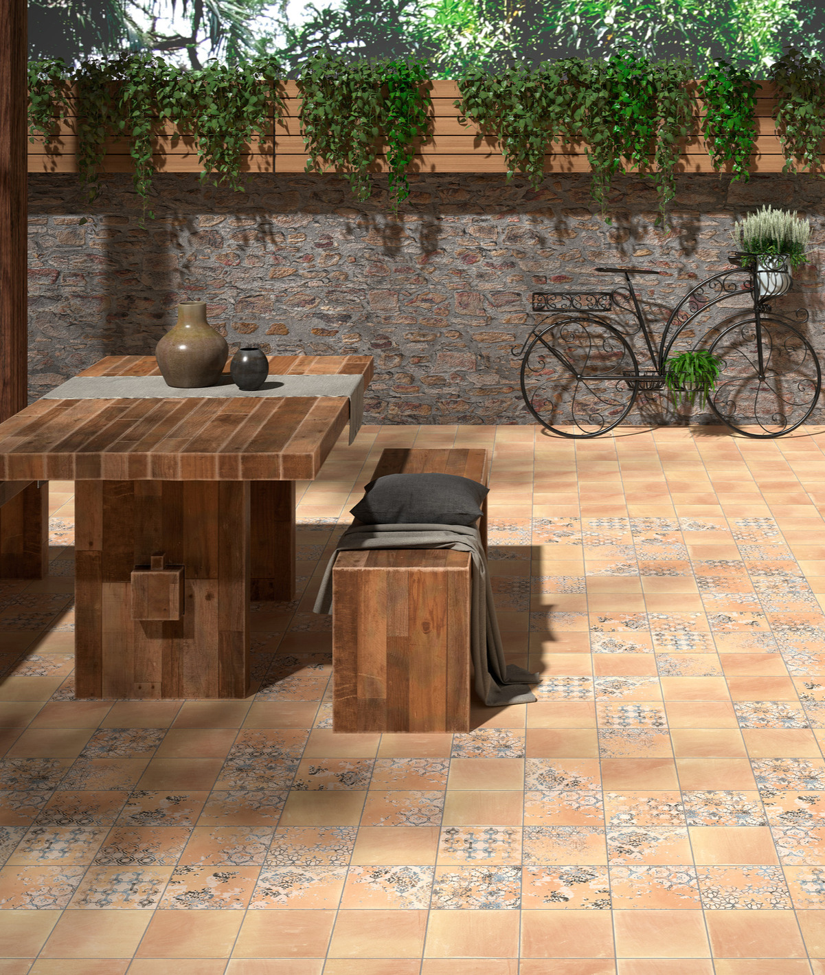 Warm and worn naturally varied terracotta style porcelain tiles.